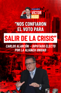 Carlos Alarcón, diputado electo por la Alianza Unidad, destacó que el respaldo ciudadano en las urnas es un mandato claro para superar la crisis política y económica que atraviesa el país.