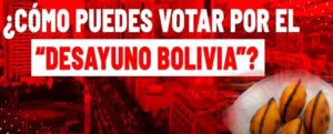 ¡Bolivia ya está en las semifinales del mundial de desayunos! Nuestro país compite con sus deliciosas salteñas y el tradicional api con pastel frente a las arepas venezolanas. ¿Qué estás esperando para apoyar? Escanea los QR y vota por Bolivia. ¡Juntos llevemos nuestra gastronomía al triunfo! ¡Vamos Bolivia!
