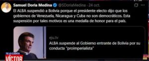 SAMUEL DORIA MEDINA: «ESTA SUSPENSIÓN DEL ALBA A BOLIVIA ES UNA MEDALLA DE HONOR PARA EL PAÍS»
